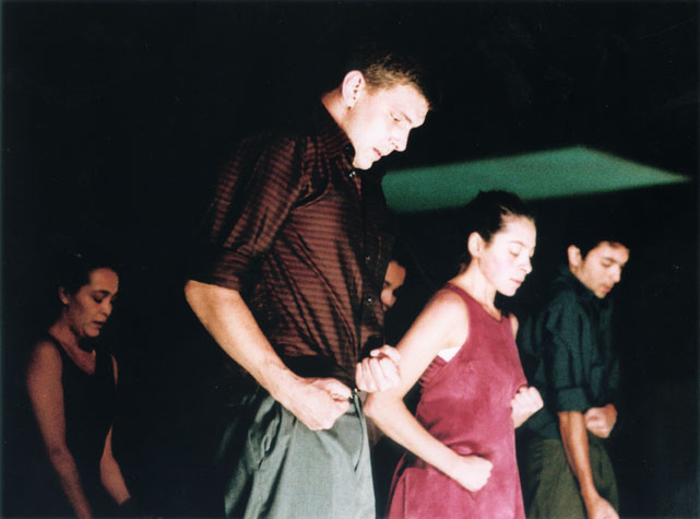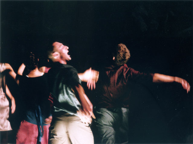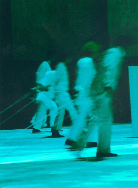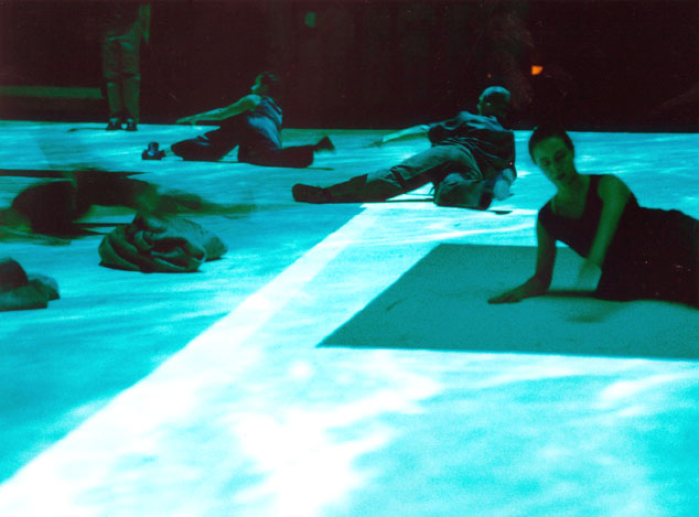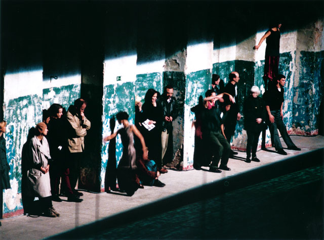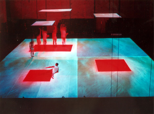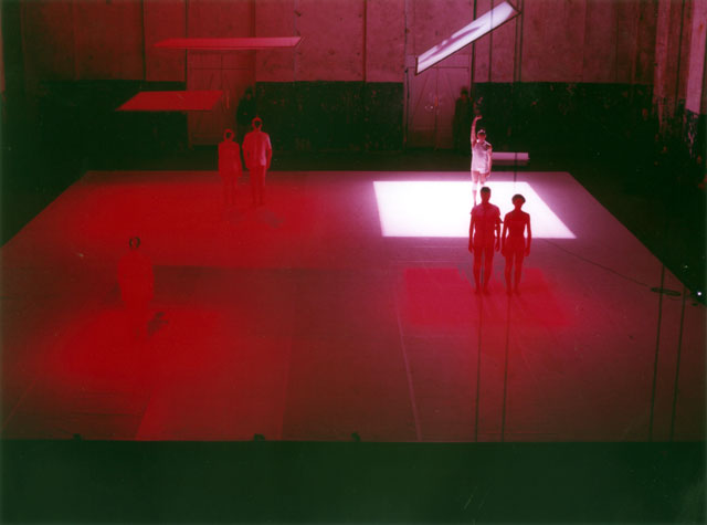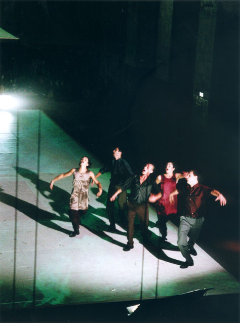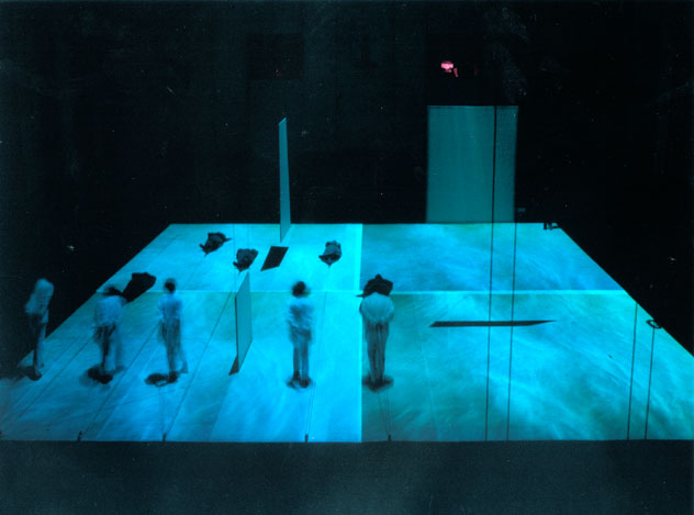 Six dancers, accompanied by a choir and recorded sound, find themselves – as people of the most diverse origins – in an enclosed space to undergo a single, identical test that will determine their future and, with it, their hopes and visions. In this zone, governed by its own unknown laws, they look back on their lives so far before undergoing rituals at various stations, in which they attempt to forget their origins, history and traditions in order to conform to the image of humanity that will grant them entry into a new life in a new place. In this endeavour, they draw closer to one another and thus experience their first sense of solidarity within a community of the homeless. In the end, a deserted place remains, and with it the stories of the people whose life journeys were divided here into the past and the future.